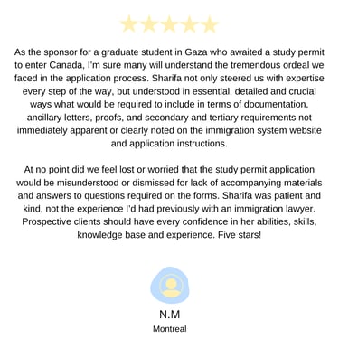 Sharifa was our bright light through all of this. Any stress or anxiety I had about our application was essentially erased due to her professional and dedicated help. She ensured that we supplied all the right documents along with letters from family and friends. We were very thankful that our lawyer was affordable for us, but we are sincerely thankful for her services. Sharifa acted with integrity, empathy, respect, honesty, communicated with us frequently, and provided additional help and knowledge even after the process was over